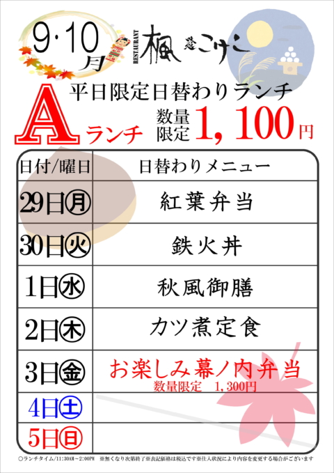 9・10月の日替わりランチ
