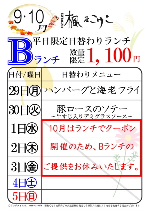 ※10月はランチでクーポン開催のため、Bランチのご提供をお休みいたします。