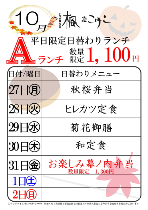 10月27日(月)~10月31日(金)の日替わりランチメニューです!