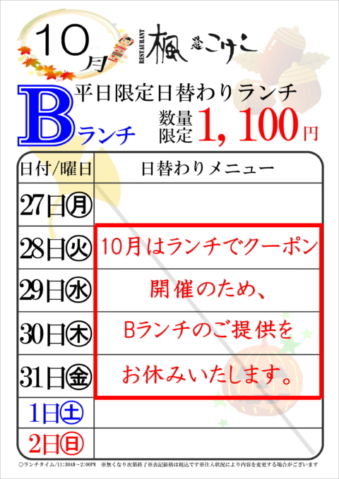 ※10月はランチでクーポン開催のため、Bランチのご提供をお休みいたします。