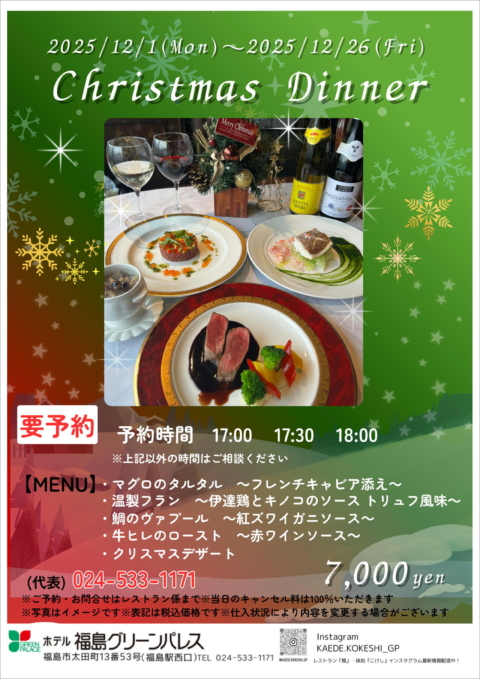 レストラン『楓』クリスマスディナー 今年も開催いたします!