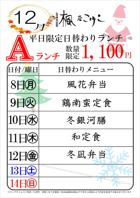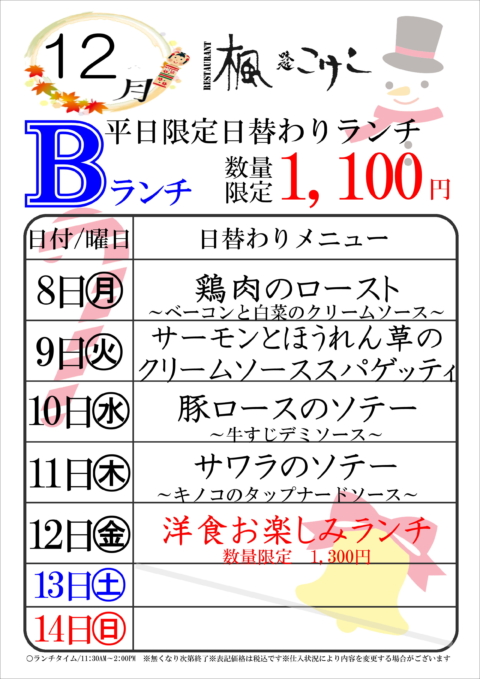 12月8日(月)~12月12日(金)の日替わりランチメニューです!