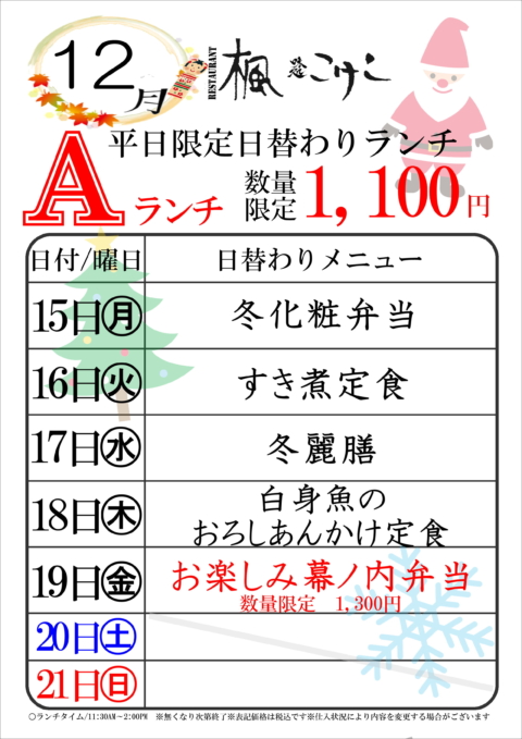 12月15日(月)~12月19日(金)の日替わりランチメニューです!