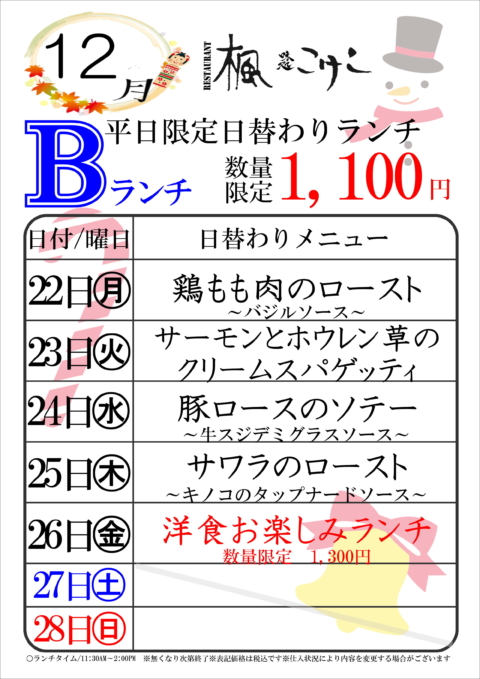 12月22日(月)~12月26日(金)の日替わりランチメニューです!