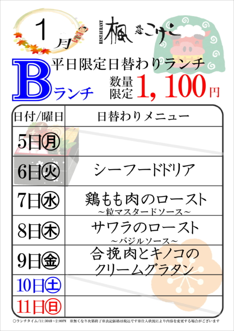 1月5日(月)~1月9日(金)の日替わりランチメニューです!