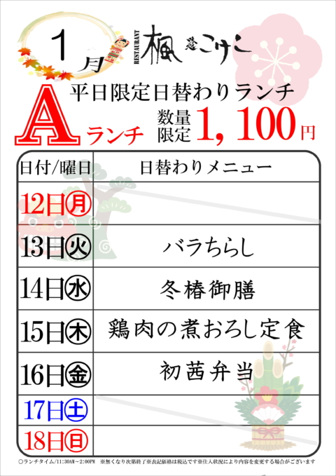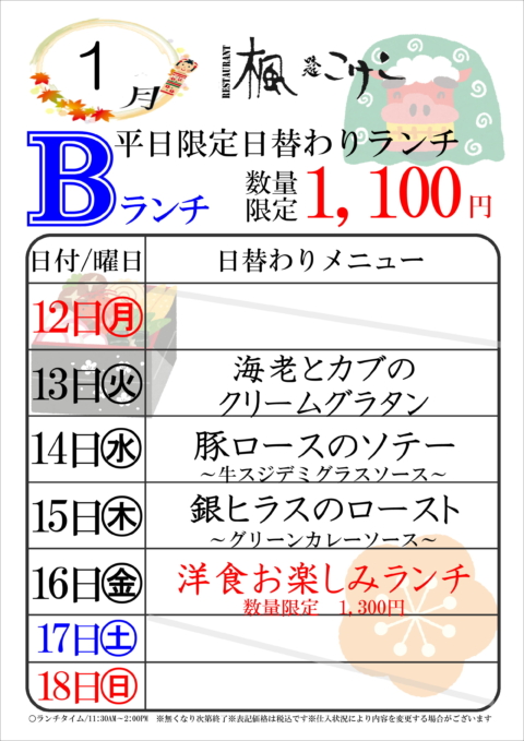 1月12日(月)~1月16日(金)の日替わりランチメニューです!