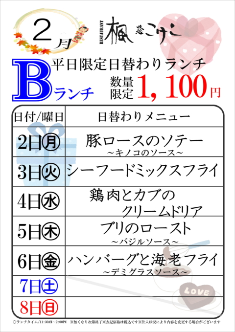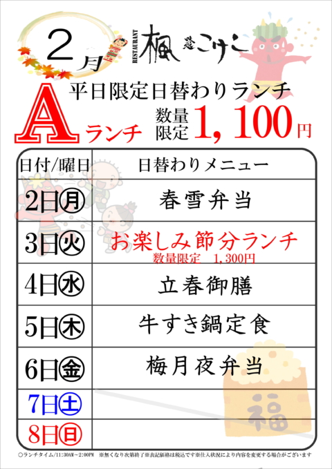 2月2日(月)~2月6日(金)の日替わりランチメニューです!