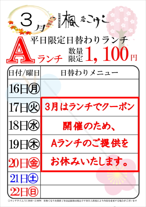 ※3/1㊐~4/15㊌はランチでクーポン開催のため、Aランチのご提供をお休みいたします。ご迷惑をおかけしますが、何卒ご了承お願いいたします。