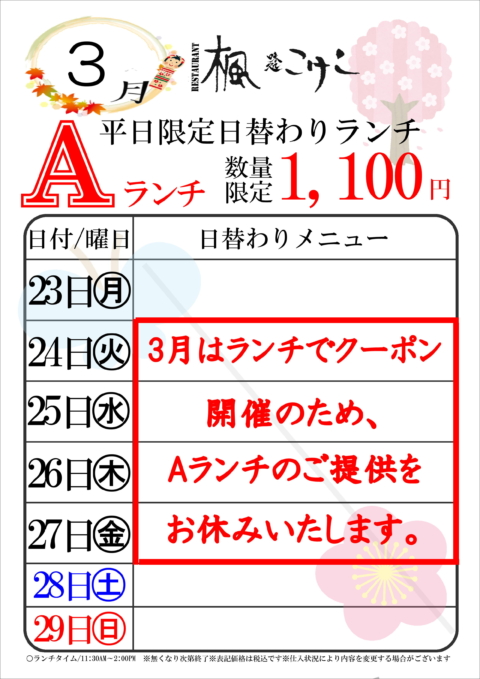 ※3/1㊐~4/15㊌はランチでクーポン開催のため、Aランチのご提供をお休みいたします。ご迷惑をおかけしますが、何卒ご了承お願いいたします。