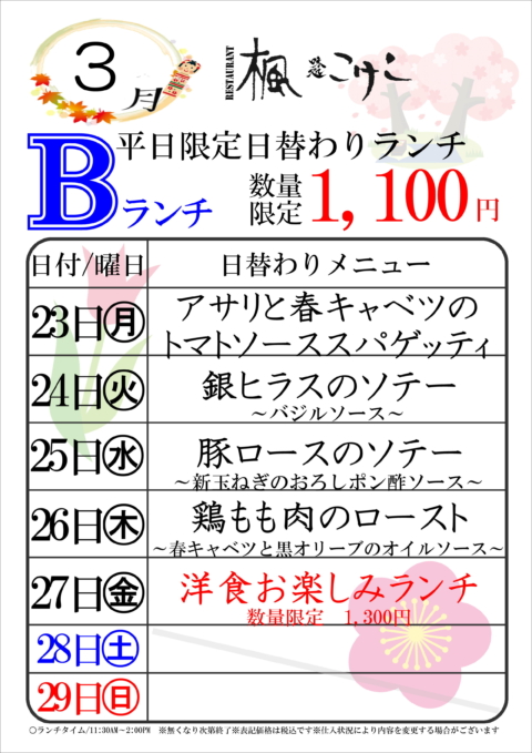 3月23日(月)~3月27日(金)の日替わりランチメニューです!