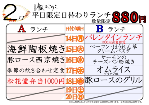 2月14日㊊~2月18日㊎の日替わりランチメニューです!