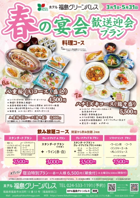 会議・宴会Meetings / Banquets ホーム > お知らせ > 総合 > 【御宴会】🌸春の宴会!歓送迎会プラン!🌸3月1日より 【御宴会】🌸春の宴会!歓送迎会プラン!🌸3月1日より 2026/02/22 冬から春へと移り変わる季節、 少しずつ暖かくなり、訪れるのは 送別会、歓迎会です。 会場は見つかりましたか? 10人から200人 人数に合わせた会場をご用意してますので、 この機会にご利用くださいませ! カテゴリー 総合(463) 宿泊(32) レストラン(414) ご宴会(32) 最近の投稿 【御宴会】🌸春の宴会!歓送迎会プラン!🌸3月1日より 【ご宴会】❄️冬の宴会(忘年会・新年会)プラン12月1日よりスタート❄️ 【ご宴会】🍁秋の宴会プラン🍁9月1日よりスタート 【御宴会】☀️夏の宴会プラン☀️6月1日より 【会議・セミナー時にご利用ください】グリーンパレスのお弁当 月別投稿一覧 月を選択 2026年2月 (1) 2025年11月 (1) 2025年8月 (1) 2025年5月 (1) 2023年11月 (1) 2021年7月 (2)
